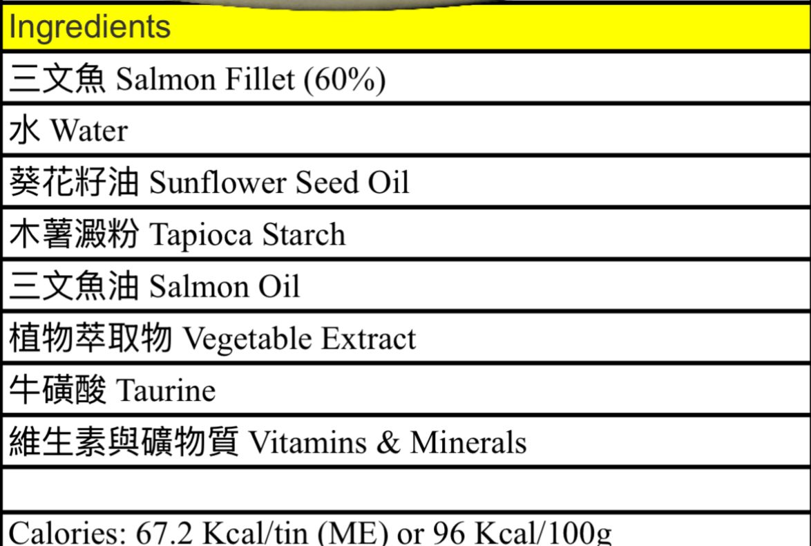 Salmon (60%), water, sunflower oil, tapioca starch, Salmon oil, vegetable extracts, taurine, vitamins & minerals