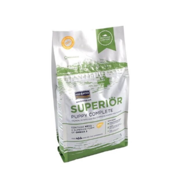 Fish4Dogs Superior Puppy – A salmon, potato and pea complete dinner for puppies - with 30% protein level to support the puppies growth and development.