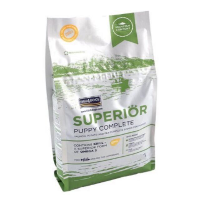 Fish4Dogs Superior Puppy – A salmon, potato and pea complete dinner for puppies - with 30% protein level to support the puppies growth and development.