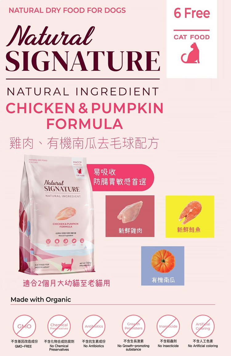 1.6公斤 Natural Signature 雞肉有機南瓜去毛球天然全貓糧 (內有獨立包裝 200克x8包), 韓國製造